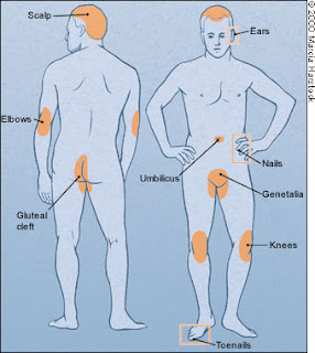 - Predileksi di siku, lutut, kulit kepala dan punggung bawah.